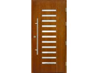 Drzwi Favorit wykonane z drewna dębowego, grubość skrzydła 78mm w systemie przylgowym, rama skrzydła z drewna mahoń-meranti konstrukcja wewnętrzna skrzydła to kratownica drewniana wypełniona pianką o grubości 54mm, rama wzmocniona profilem stalowym "C" 40x20mm, poszycie zewnętrzne skrzydła to wodoodporne sklejki mahoń-maranti o grubości 12mm, wręg antywyważeniowy, zamek listwowy klasy C, ościeżnica o wymiarze 125x60mm z profilem AL z wkładką termiczną, malowanie pięciopowłokowe, próg aluminiowy z wkładką termiczną (tzw. ciepły).