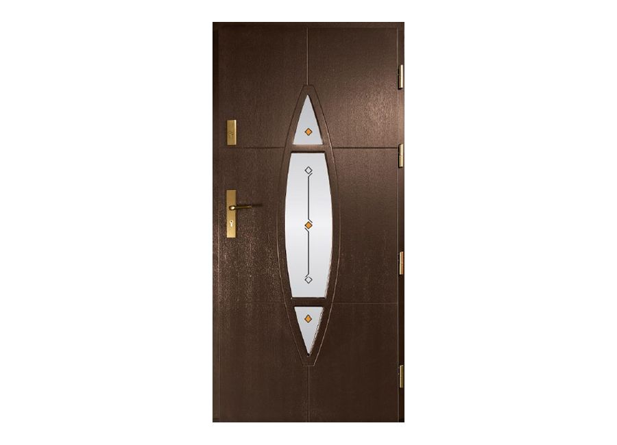 Drzwi Stolterm wykonane z drewna dębowego, grubość skrzydła 92mm w systemie przylgowym, rama skrzydła z drewna mahoń-meranti konstrukcja wewnętrzna skrzydła to kratownica drewniana wypełniona pianką o grubości 68mm, rama wzmocniona profilem stalowym "C" 40x20mm, poszycie zewnętrzne skrzydła to wodoodporne sklejki mahoń-maranti o grubości 12mm, wręg antywyważeniowy, zamek listwowy klasy C, ościeżnica o wymiarze 95x70mm z profilem AL z wkładką termiczną, malowanie pięciopowłokowe, próg aluminiowy z wkładką termiczną (tzw. ciepły).
