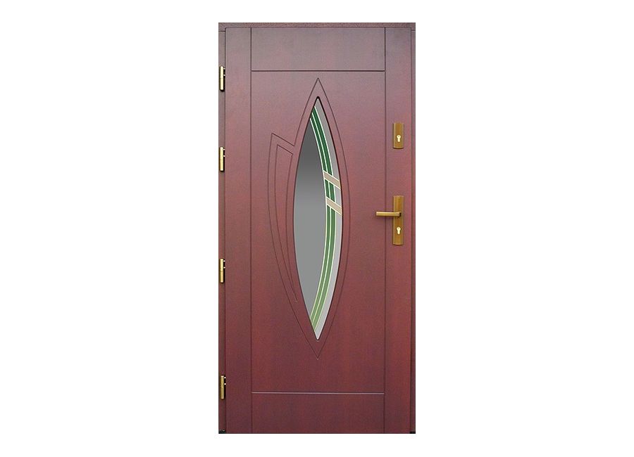 Drzwi Stolterm wykonane z drewna dębowego, grubość skrzydła 92mm w systemie przylgowym, rama skrzydła z drewna mahoń-meranti konstrukcja wewnętrzna skrzydła to kratownica drewniana wypełniona pianką o grubości 68mm, rama wzmocniona profilem stalowym "C" 40x20mm, poszycie zewnętrzne skrzydła to wodoodporne sklejki mahoń-maranti o grubości 12mm, wręg antywyważeniowy, zamek listwowy klasy C, ościeżnica o wymiarze 95x70mm z profilem AL z wkładką termiczną, malowanie pięciopowłokowe, próg aluminiowy z wkładką termiczną (tzw. ciepły).