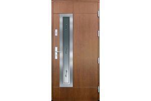 Drzwi Stolterm wykonane z drewna dębowego, grubość skrzydła 92mm w systemie przylgowym, rama skrzydła z drewna mahoń-meranti konstrukcja wewnętrzna skrzydła to kratownica drewniana wypełniona pianką o grubości 68mm, rama wzmocniona profilem stalowym "C" 40x20mm, poszycie zewnętrzne skrzydła to wodoodporne sklejki mahoń-maranti o grubości 12mm, wręg antywyważeniowy, zamek listwowy klasy C, ościeżnica o wymiarze 95x70mm z profilem AL z wkładką termiczną, malowanie pięciopowłokowe, próg aluminiowy z wkładką termiczną (tzw. ciepły).